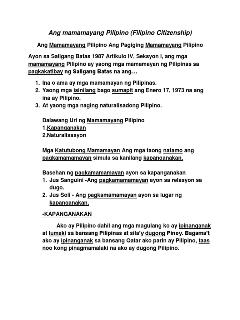 JUS SOLI o JUS LOCI o Karapatan ng Lupa ayon sa lugar ng kapanganakan NATURALISASYON- pormal na paghingi ng pagkamamamayan ng isang dayuhan sa pamahalaan. Ayon kay Yeban 2004 ang isang responsableng mamamayan ay. Ang Likas na Mamamayan Mula sa Saligang Batas 1987 Artikulo IV Seksyon 1 makikita ang mga pamantayan ng pagiging isang mamamayan ng Pilipinas.