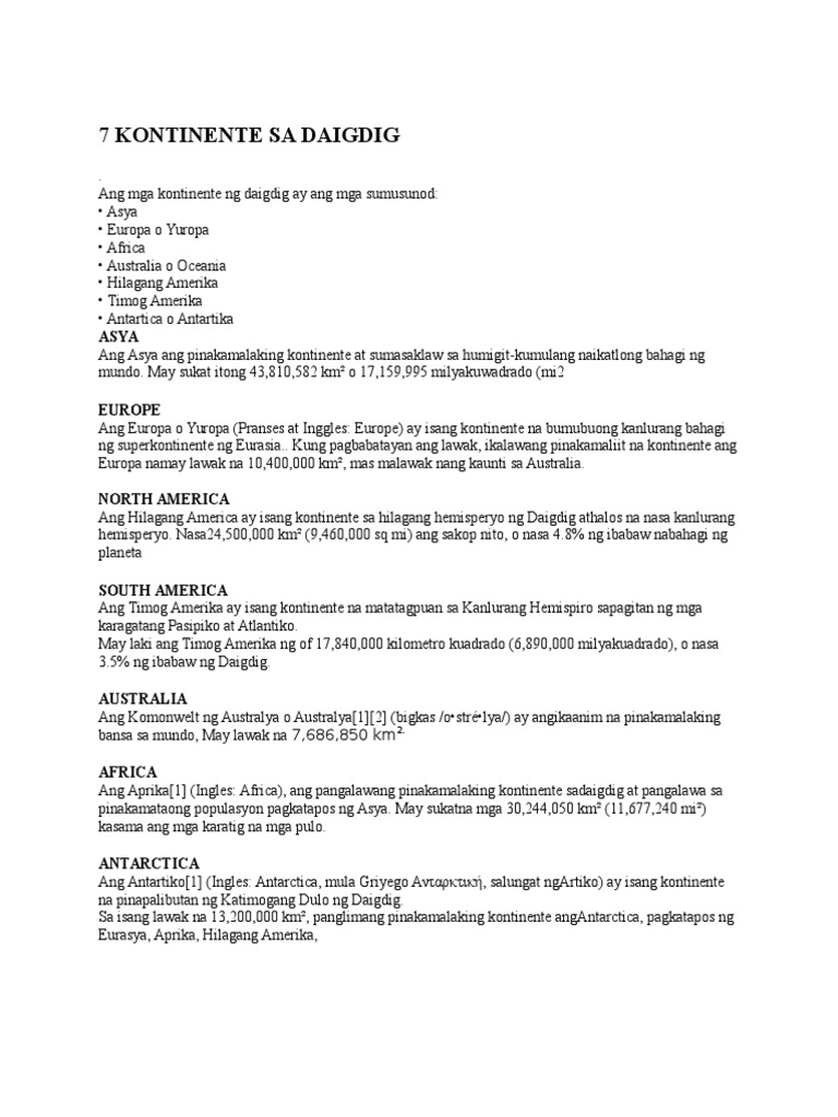 Mga dahilan kung paano nagwakas ang ikalawang digmaang pandaigdig narito sa mga sumusunod. Pitong Kontinente ng Mundo asya europahilagang amerikatimog amerika aprika australiaantartikaMga Katangian nitoASYAAng Asya ang pinakamalaking kontinenteIto ang bumubuo sa 33 ngkabuuang lupa sa mundo. Pangalawa sa pinakamalaking kontinente sa daigdiggayundin sa laki ng populasyon.