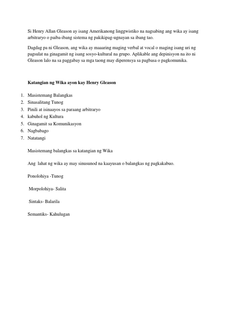 Si Henry Allan Gleason Ay Isang Amerikanong Linggwistiko Na Nagsabing Ang Wika Ay Isang Arbitraryo O Paiba Pdf