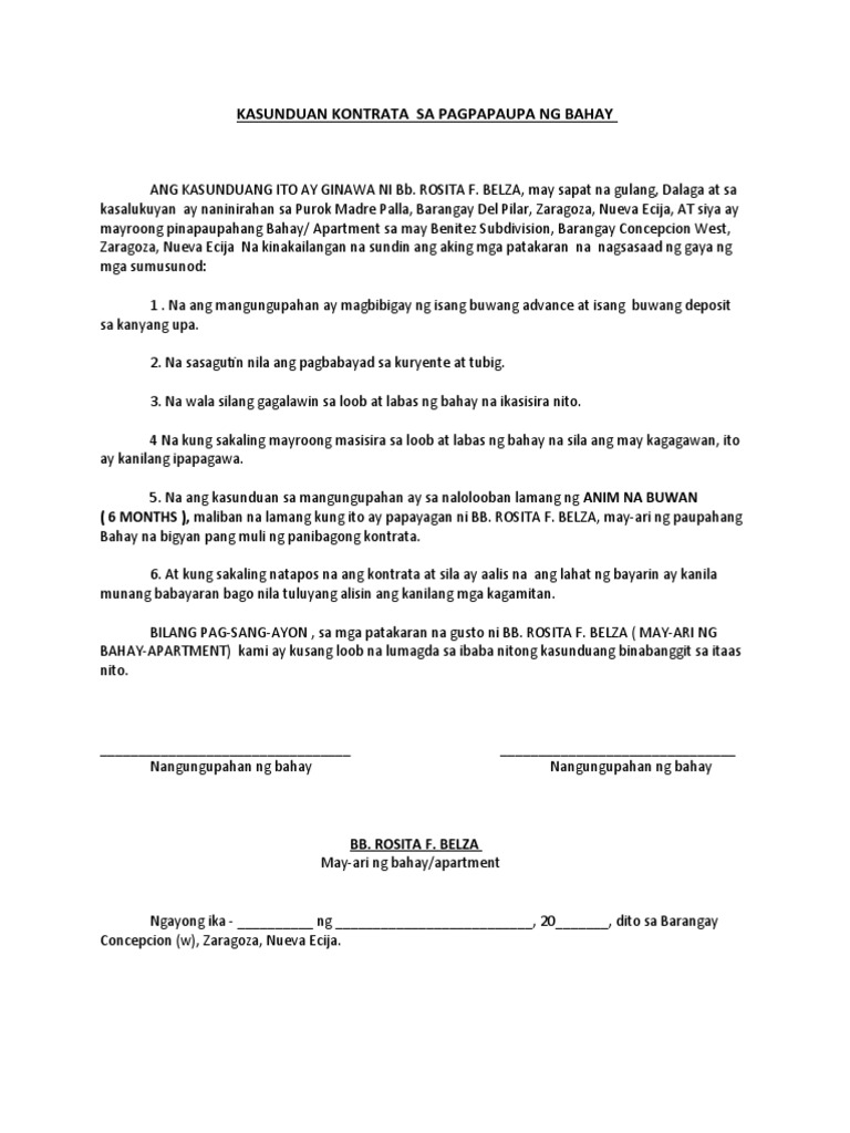 Kasunduan sa pagpapaupa Find here an example of Rental house in Tagalog Philippines. Teritoryo ng Pilipinas Ayon sa Pandaigdigang Kasunduan at Ayon sa Saligang Batas Ayon sa Pandai-gdigang Kasun-duan Mula sa baseline ay tinukoy ang sumusunod bilang saklaw na teritoryo ng isang bansa. Contextual translation of ayon sa aming napagkasunduan into English.