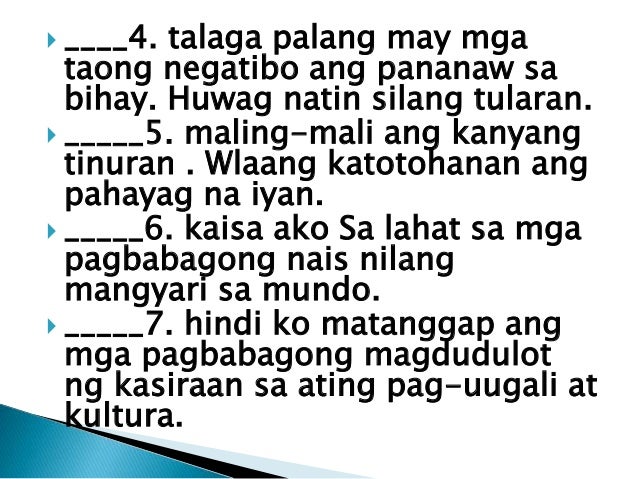 Ayaw kong maniwala sa mga taong nagsasabing higit na maganda ang buhay ngayon sa noon. F8WG-IIc-d-25 Sagutan ang panimulang pagsusulit. Panliligaw o pagpapaligaw gamit ang text message o chat.